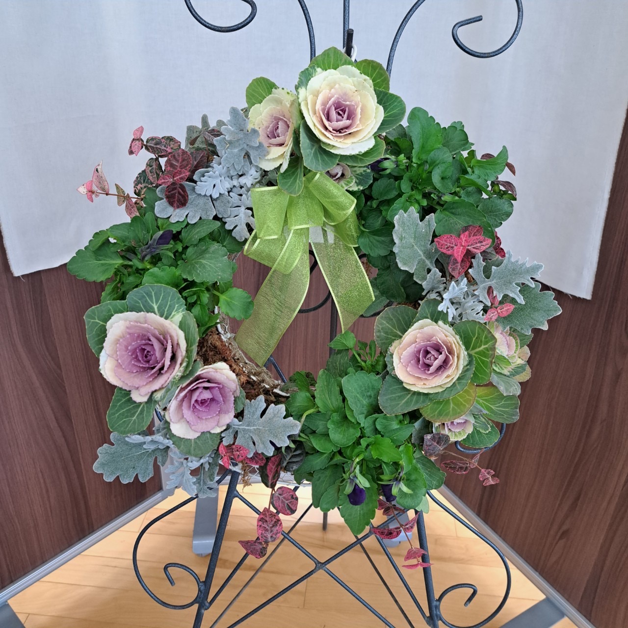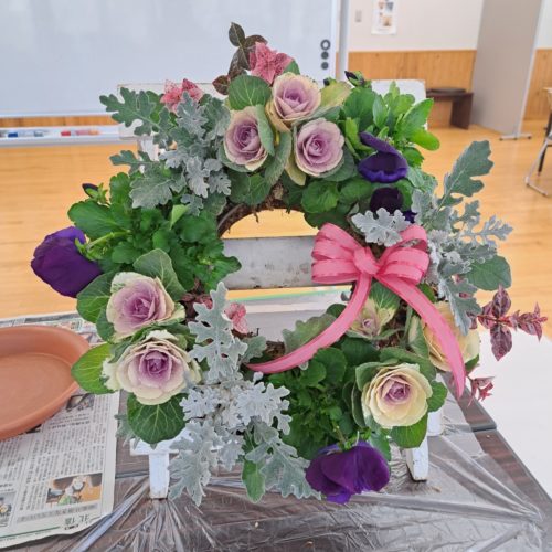 リース型の中に葉ボタンやシロタエギクが入って、クリスマス気分も盛り上がる制作🎅