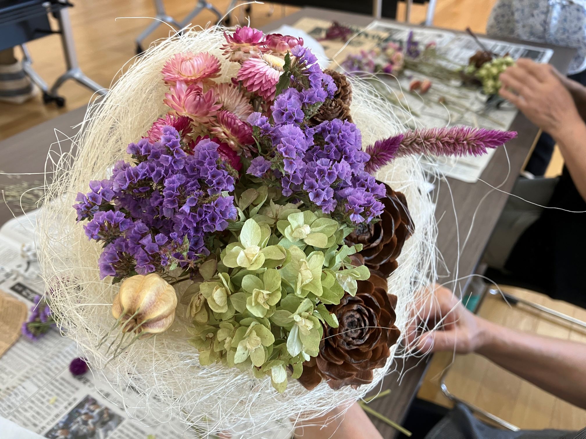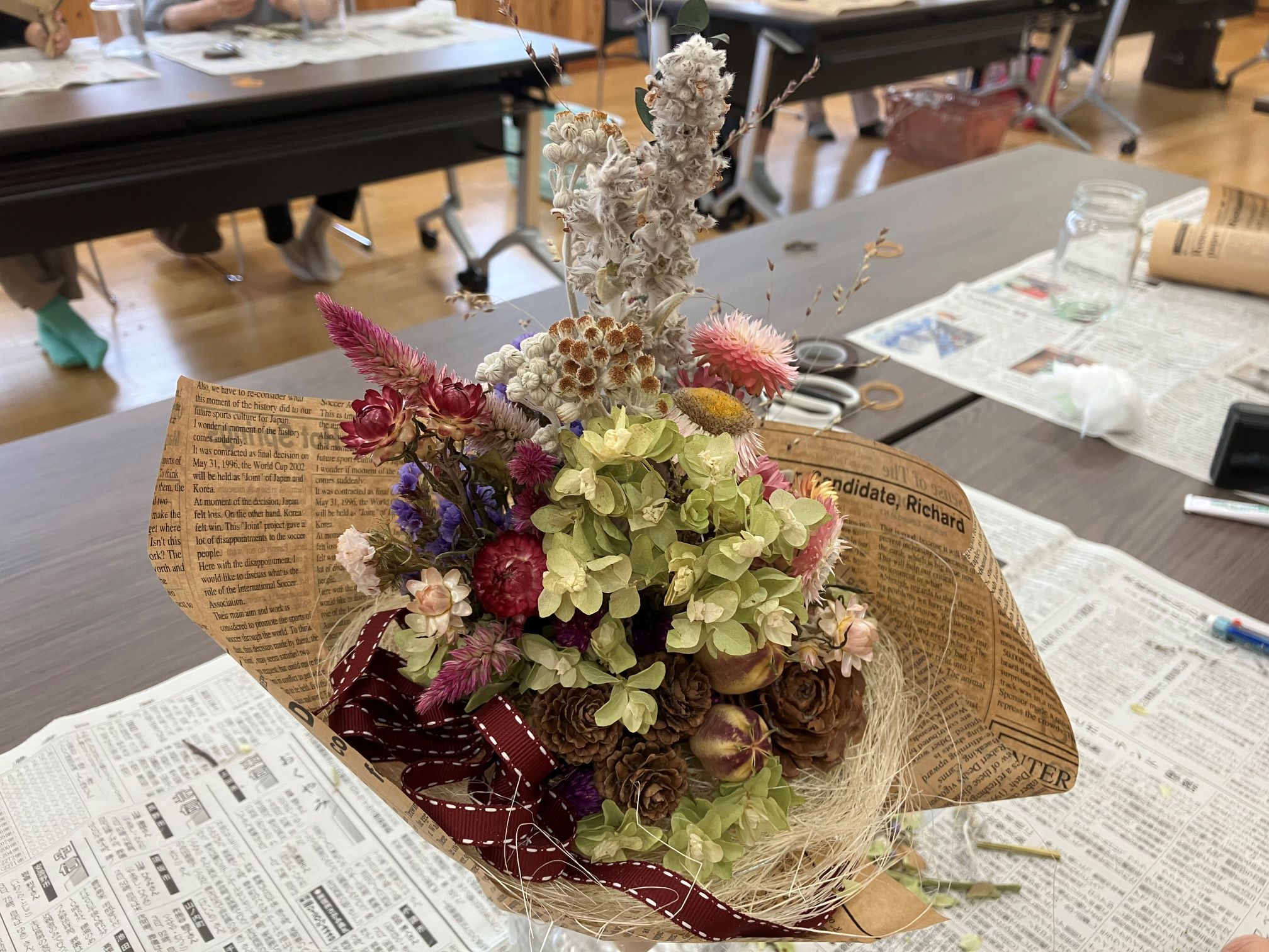 公園で収穫した実や草花をドライフラワーにしたものを使って、花束づくりの講座を開催させていただきました(*^^*)