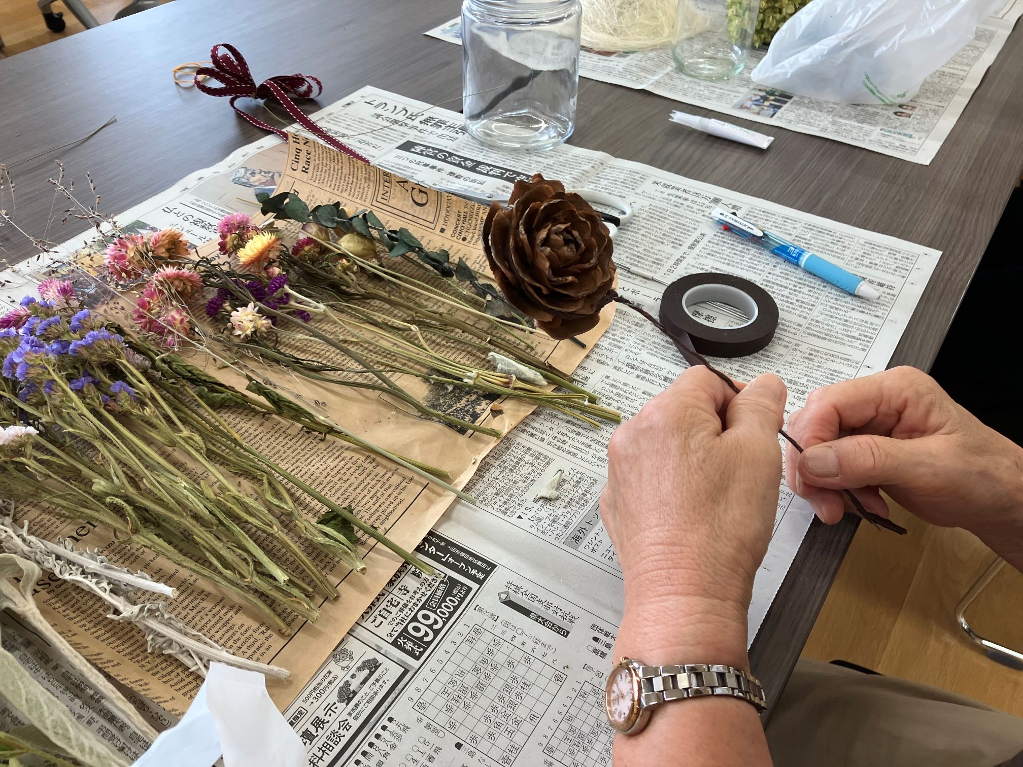 みなさん、ワイヤーやフローラテープを巻くのに苦労されていらっしゃいました。