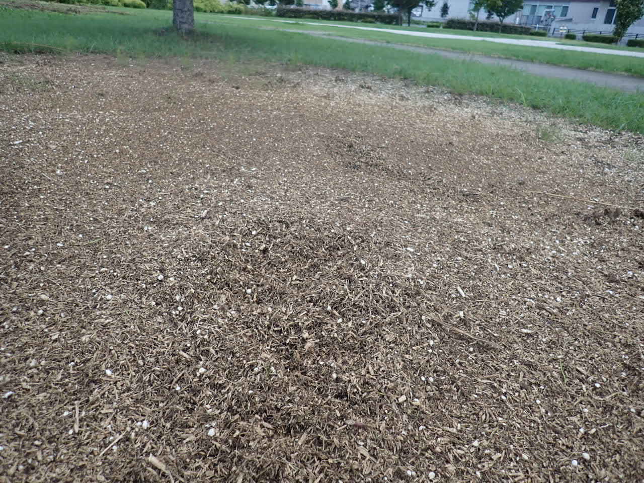 ①を効率的に実行するために、粉砕機(枝などをチップにする機械)を導入してみました。マルチングによる効果を先ほど述べましたが、「土を育てる」ことをより意識すると、たとえばわらを敷くにしても、束の状態で敷くよりも、細かく粉砕されていたほうが土壌動物が分解しやすくなります。すぐにエサとして食べてもらえるほうが、「土を育てる」ことにスピード感が出るはずです。そのため、マルチングする際には、細かく粉砕した状態が効果的だろうと考えました。 実際に大きくなりすぎてしまったススキの葉や、通常は処分していたヒマワリやコスモスの茎や葉を粉砕機で細かく砕き、むきだしになっていた花壇の土にマルチングしてみました。まるでペットを飼うかのように、土壌動物や微生物にエサを供給する感覚です。「土を育てる」ということは、土を育ててくれる「土壌動物や微生物を育てる」ということだと感じています。