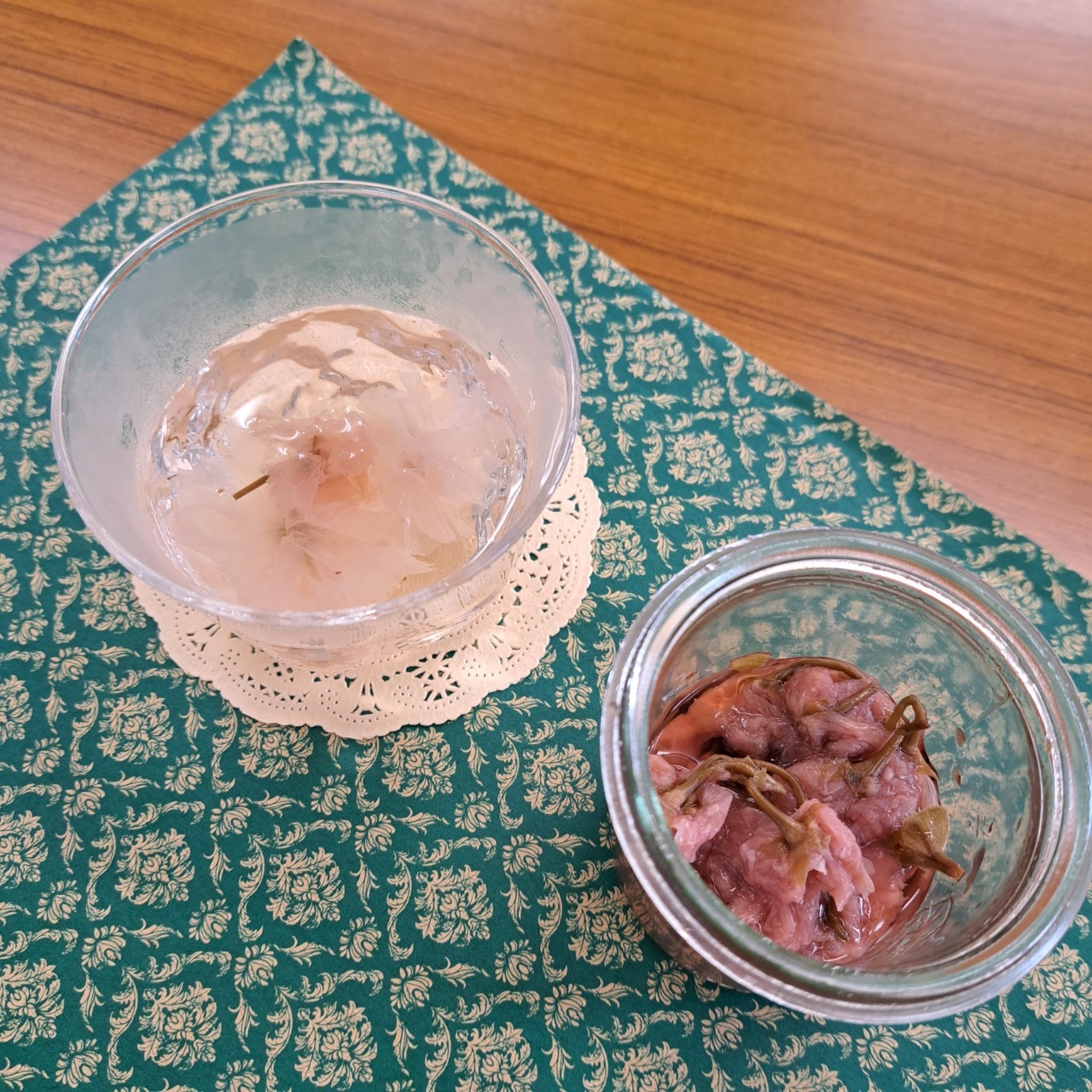 監修してくださっているハーブ研究家 徳永淳子先生が公園の八重桜を酢漬けしておいてくださり、桜湯でお茶会🍵